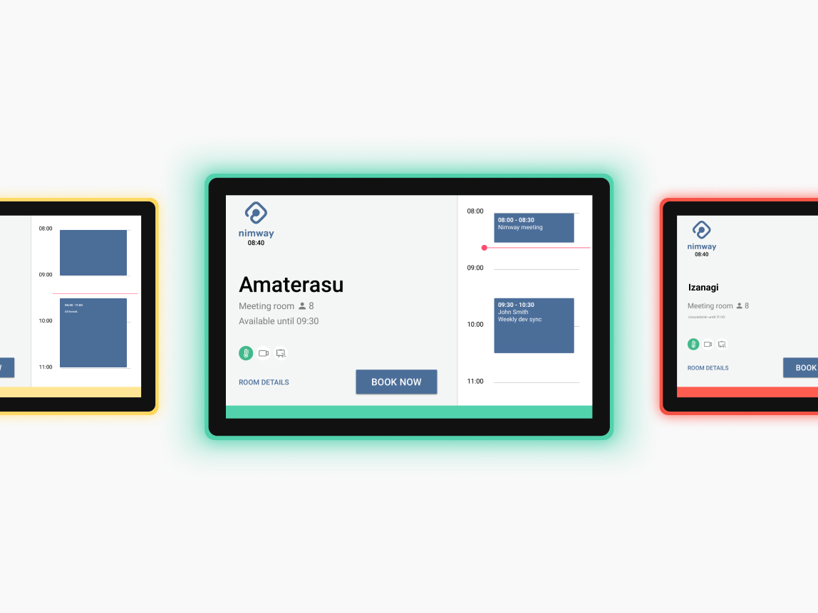 Find the location of your next meeting, see available resources and secure rooms ad hoc with Room panels and Floor plans from Nimway.