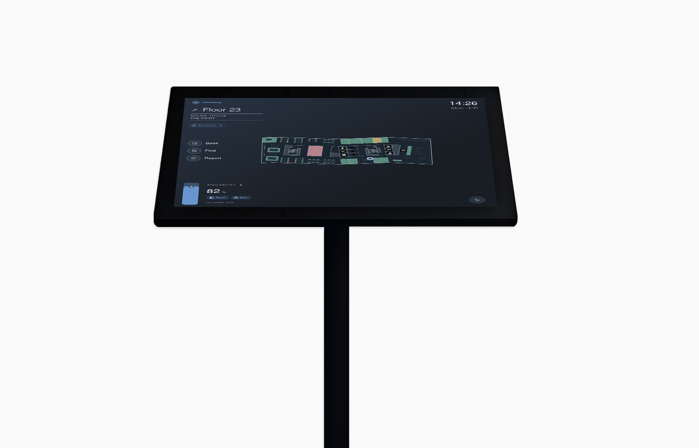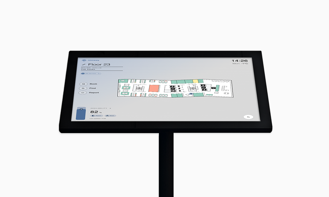 Whether placed on a stand, for example in entrances and open areas, or mounted on a wall in more central locations, TouchPlan provides a centralized view of the entire office or building, giving users instant access to spaces, availability and navigation from one screen.
